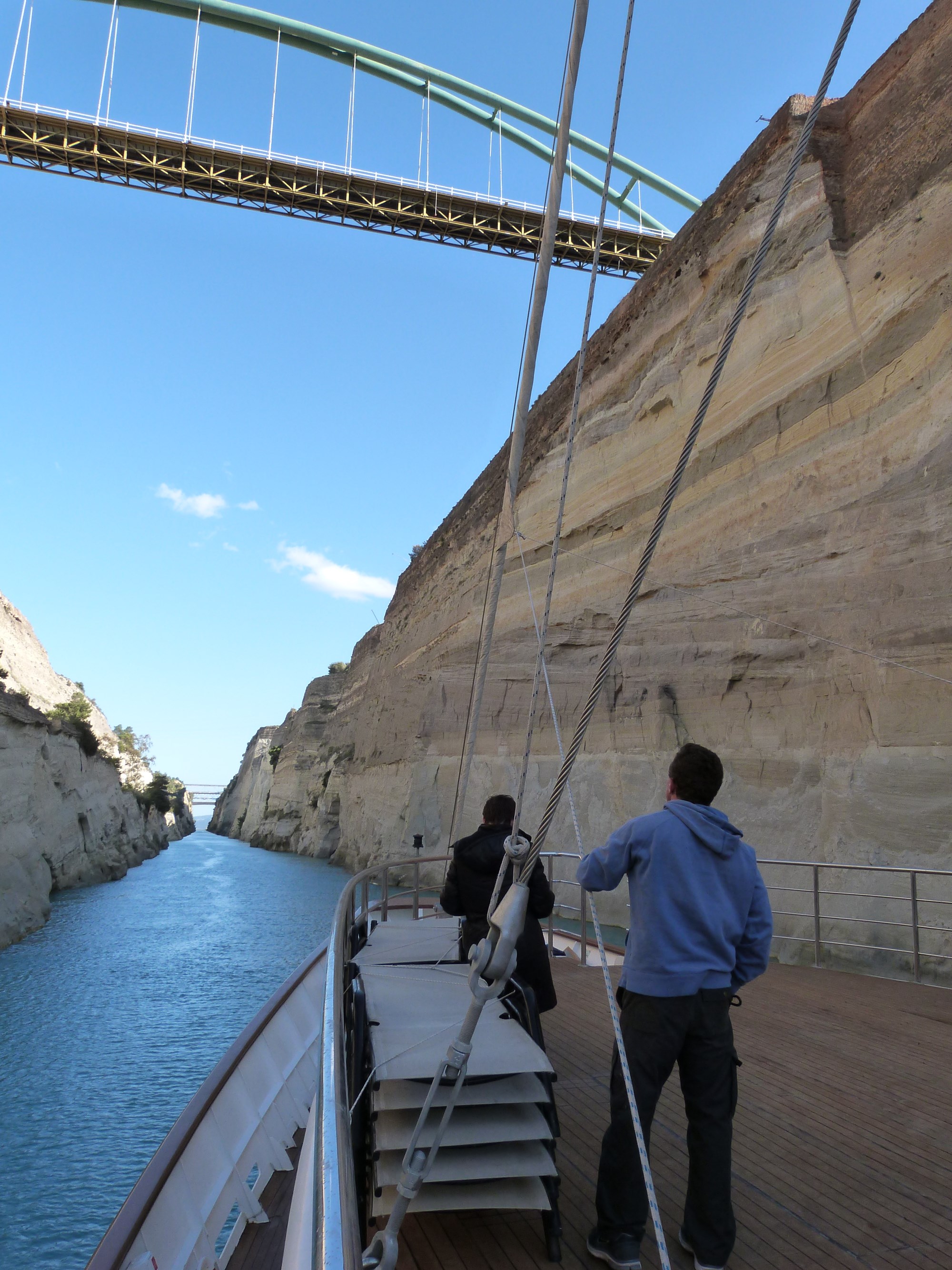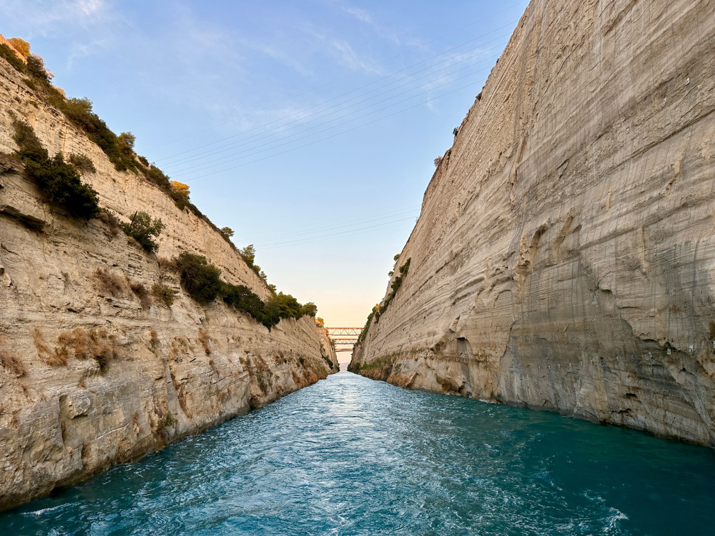 A crossroads in time and space. Transit the amazing engineering feat that is the Corinth Canal, cut though solid rock in the 1880’s to join the Gulf of Corinth with the Aegean Sea. Under Periander in the 6th century BC, the ancients cut out a slipway that allowed ships to be dragged overland, but it took a lot of muscle power. The canal finally opened in 1893 after 11 years of digging. Six kilometers long, it slices through cliffs 90 m high and is a perennial favorite with sightseers.