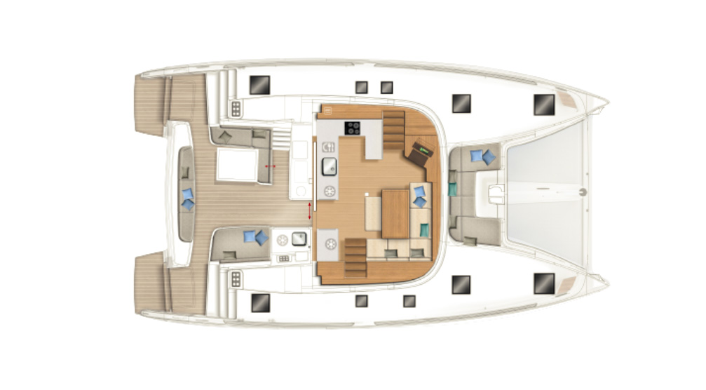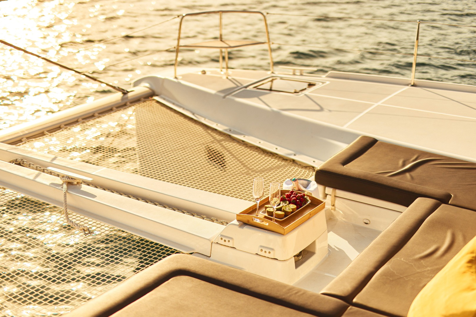Life on board Catamaran Naya centres around relaxation and indulgence. The spacious foredeck with comfortable sun pads invites you to unwind under the Mediterranean sun, while the aft cockpit provides the ideal setting for al fresco dining with panoramic sea views. Inside, the stylish saloon features an open-plan galley and elegant dining area, creating a warm and welcoming space to gather and enjoy delicious meals prepared on board.
