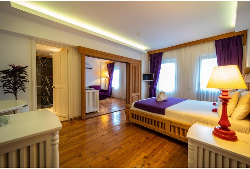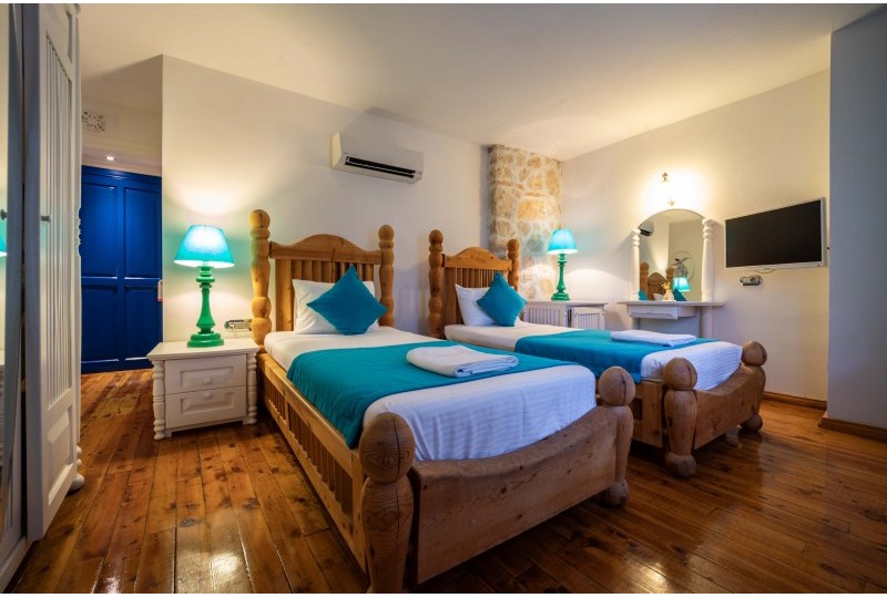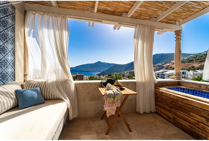 Comfortable and bright, these rooms offer views over the pool and are inspired by the crystal-clear waters of Kalkan. Each room features either twin beds or a king-size bed, air conditioning, minibar, flat-screen TV, and a private balcony.