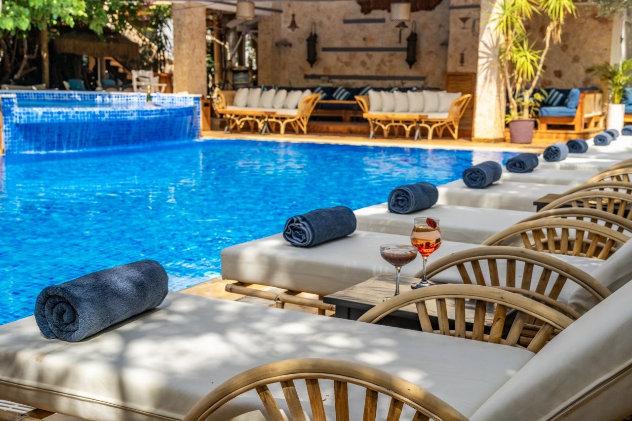 The hotel’s stylish pool area is one of its standout features, offering a relaxed setting surrounded by greenery and flowers. Guests can enjoy the comfort of private cabanas, while non-residents are also welcome to reserve these spaces in advance for a peaceful day by the pool.
