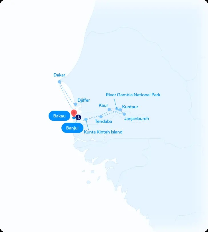 Embarkation 4pm. We leave Banjul and sail upstream to Tendaba. We reach Tendaba late into the evening. African Night - Overnight at dock in Tendaba.